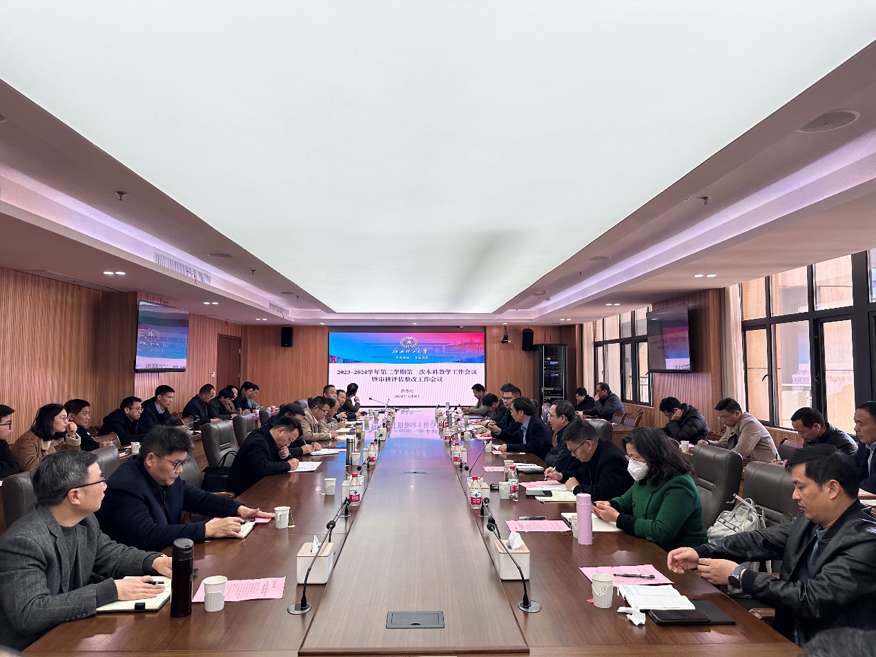 在三江校区濂溪楼2号会议室召开了2023-2024学年第二学期第一次本科教学工作会议暨审核评估整改工作会议。校党委常委、副校长黄志繁出席会议,相关职能部门负责人、各学院分管教学工作副院长及教务处全体人员参加会议。会议由校教务处处长潘春荣主持。