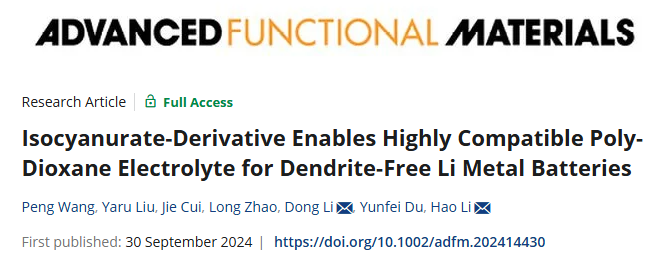 材料科学与工程学院新能源动力电池及其材料研究所在国际顶级学术刊物Advanced Functional Materials (影响因子18.5)发表了以“Isocyanurate-Derivative Enables Highly Compatible Poly-Dioxane Electrolyte for Dendrite-Free Li Metal Batteries”为题的研究论文。抖阴