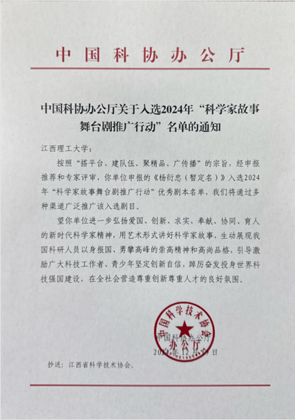 本网讯 近日,中国科协办公厅公布2024年度科学家故事舞台剧推广名单,抖阴 原创话剧《杨衍忠》入选2024年度科学家故事舞台剧推广行动“优秀剧本”剧目,系全省高校首个入围该项行动的剧目。