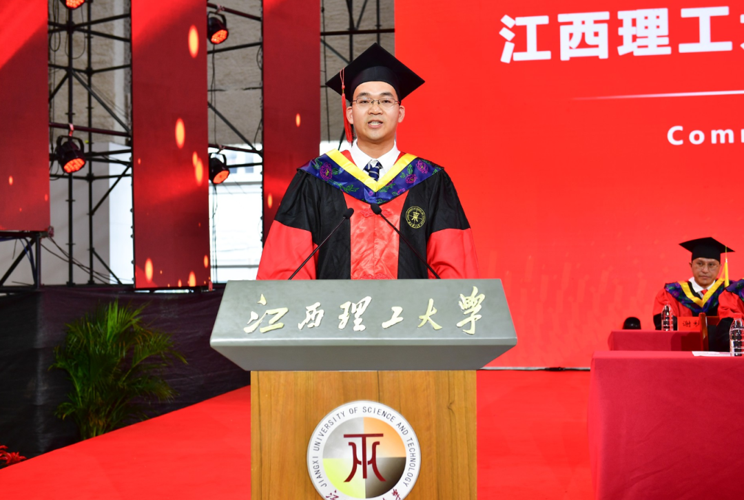 在热烈的掌声中,校长、中国工程院院士葛世荣发表讲话,寄语毕业生“熔铸家国情 薪火永相传”。他代表学校向2025届全体毕业生致以最热烈的祝贺,向悉心培育学生的师长和默默支持同学们的亲友致以崇高的敬意!他回顾了作为新时代有为青年,赓续江理红色血脉的2025届毕业生创造的历史佳绩和成长历程,列举了游科顺、邹吉椿、稀土211班等优秀个人和优秀集体的事迹,给予了2025届毕业生充分的肯定与赞扬。