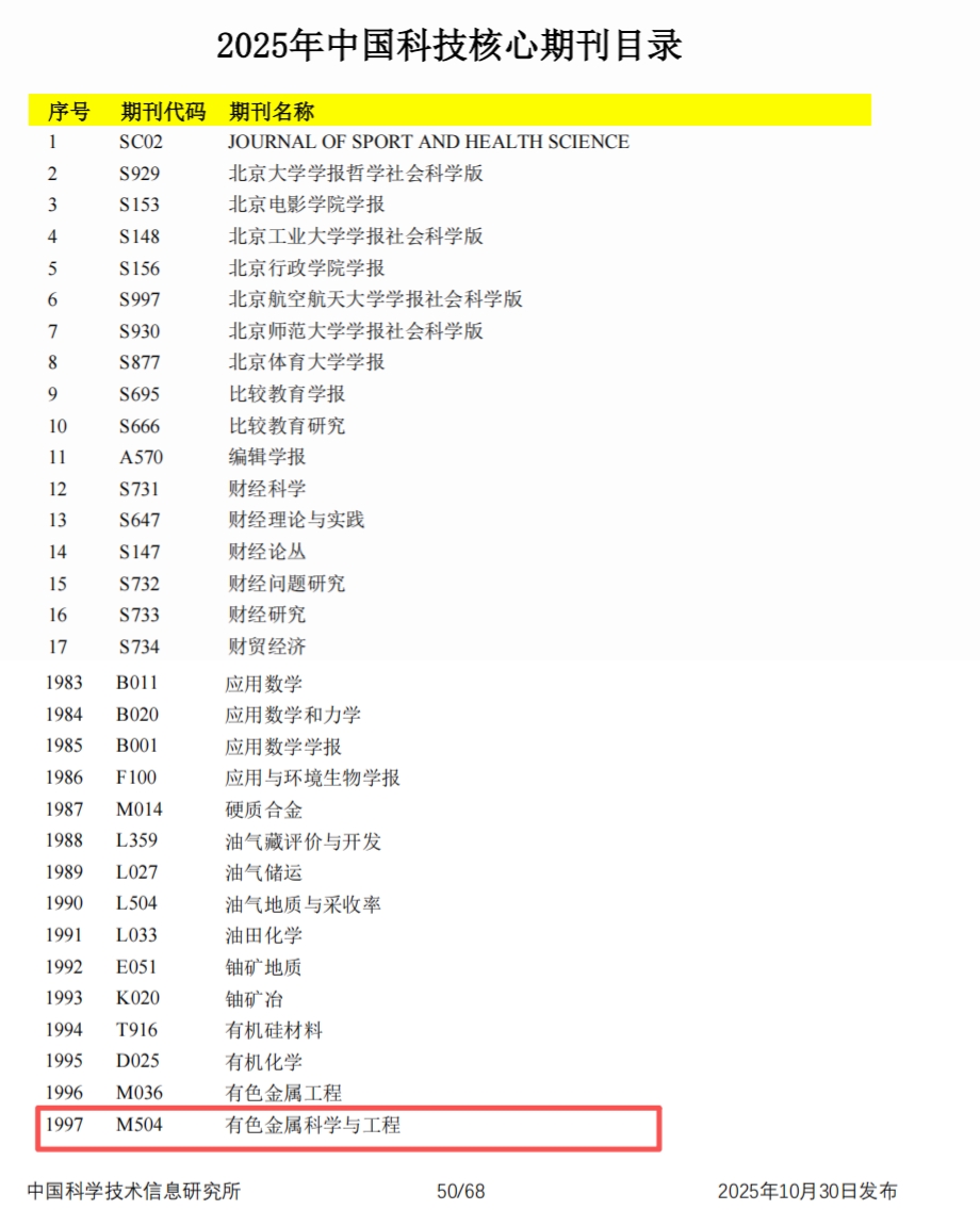 10月30日,由中国科学技术信息研究所承担的“2025年中国科技论文统计报告”在北京发布。报告同期公布了2025年版中国科技核心期刊目录,抖阴 主办的《有色金属科学与工程》成功入选,这是自2013年以来,本刊连续第十三次获此殊荣,体现了期刊在有色金属领域的长期积累与广泛认可。