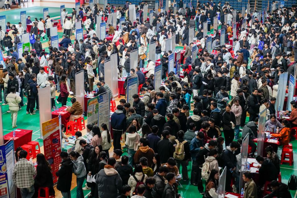 在三江校区体育馆内举办2026届毕业生宏志助航研后专场就业洽谈会。据悉,本次招聘会共吸引105家单位参会,招聘人数超过4200人。4000余名毕业生进场求职,企业累计接收简历9000余份。