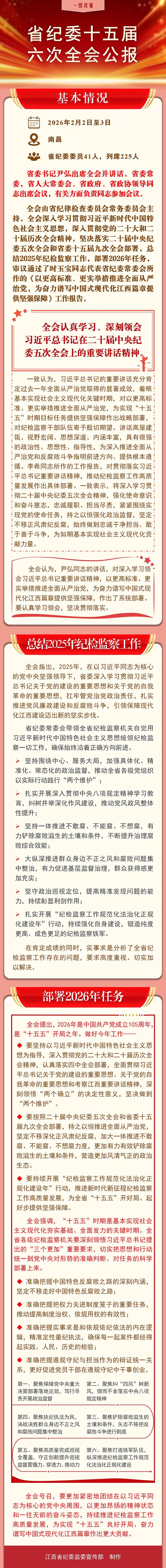 本网讯 2月2日,省纪委十五届六次全会召开。省委书记尹弘出席并讲话,他强调,要深入学习贯彻习近平总书记关于党的建设的重要思想和关于党的自我革命的重要思想,全面贯彻落实二十届中央纪委五次全会部署要求,发扬党的自我革命精神,纵深推进全面从严治党,为实现我省“十五五”良好开局、奋力谱写中国式现代化江西篇章提供坚强保障。省纪委全会传达出什么会议精神?一图带你读懂——