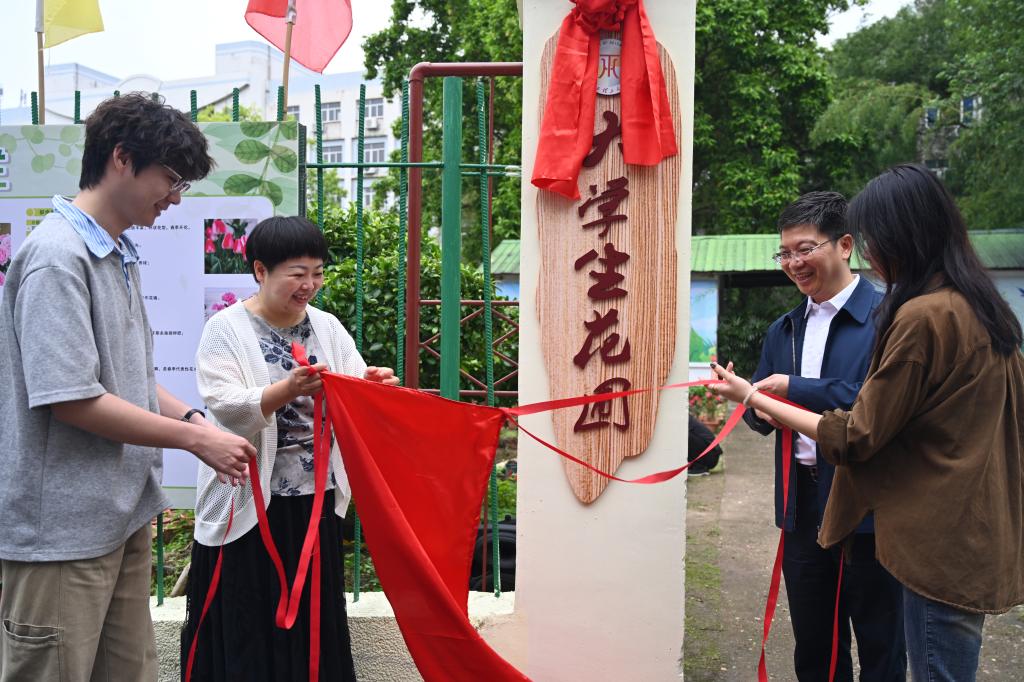 刘飞、宁洁与学生代表共同为大学生花圃揭牌。随着红绸缓缓落下,“大学生花圃”牌匾在春光中熠熠生辉。花圃与八角塘相映成趣,更与三江校区大学生公园、鹰潭铜芯农场联动互补,形成抖阴