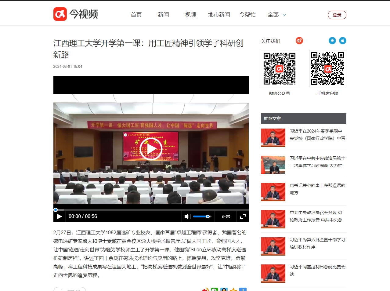 2月27日,抖阴 1982届选矿专业校友、国家首届“卓越工程师”获得者、我国著名的磁电选矿专家熊大和博士受邀在黄金校区逸夫楼学术报告厅以“做大国工匠,育强国人才,让中国‘磁选’走向世界”为题为学校师生上了开学第一课。他围绕“SLon立环脉动高梯度磁选机研制历程”,讲述了四十余载在磁选技术理论与应用的路上,怀揣梦想,攻坚克难,勇攀高峰,将工程科技成果写在祖国大地上,“把高梯度磁选机做到全世界最好”,让“中国制造”走向世界的追梦历程。