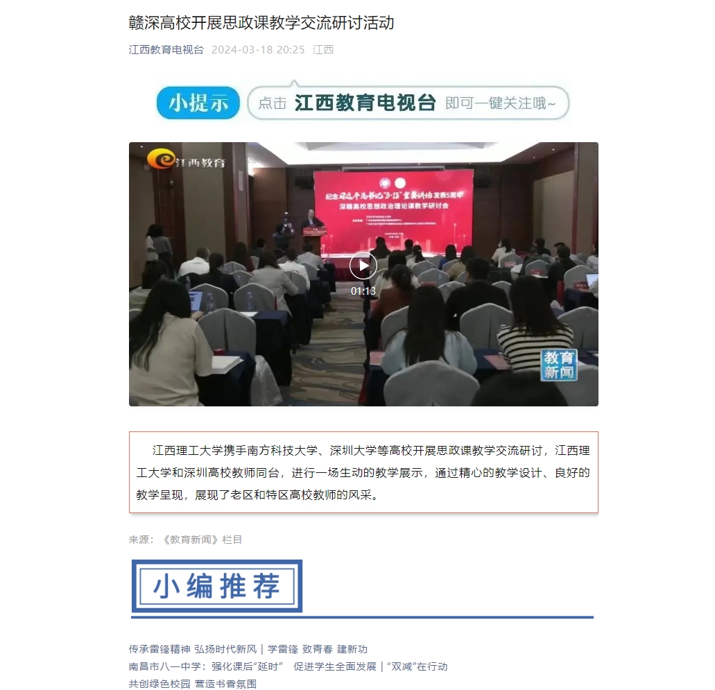 上一条:《江西思政》:老区牵手特区 谱写立德树人新篇章——赣深高校开展思政课教学交流研讨活动 下一条:《凤凰网》:赣深高校开展思政课教学交流研讨活动