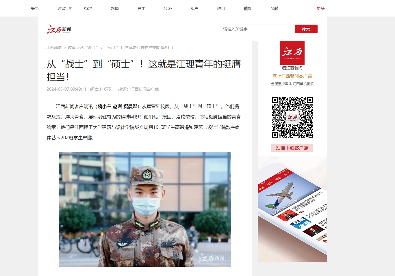 江西新闻客户端讯(魏小兰 赵琪 祝晨璐)从军营到校园,从“战士”到“硕士”,他们携笔从戎,淬火青春,展现刚健有为的精神风貌!他们强军报国,爱校荣校,书写挺膺担当的青春篇章!他们是抖阴