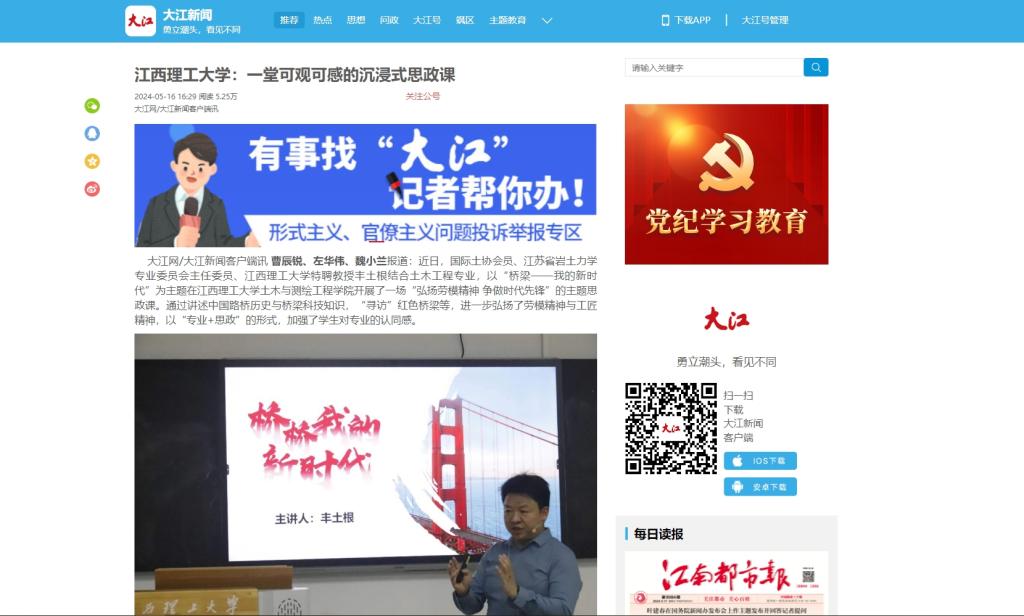 此次主题思政课是一次知识的传递,更是一次精神的洗礼。不仅加深了江理学子对中国桥梁发展史的了解,更让学生感受到了红色桥梁的独特魅力和深刻内涵。他们将以更加饱满的热情和坚定的信念,发挥自身专业知识,投身学习和工作中。