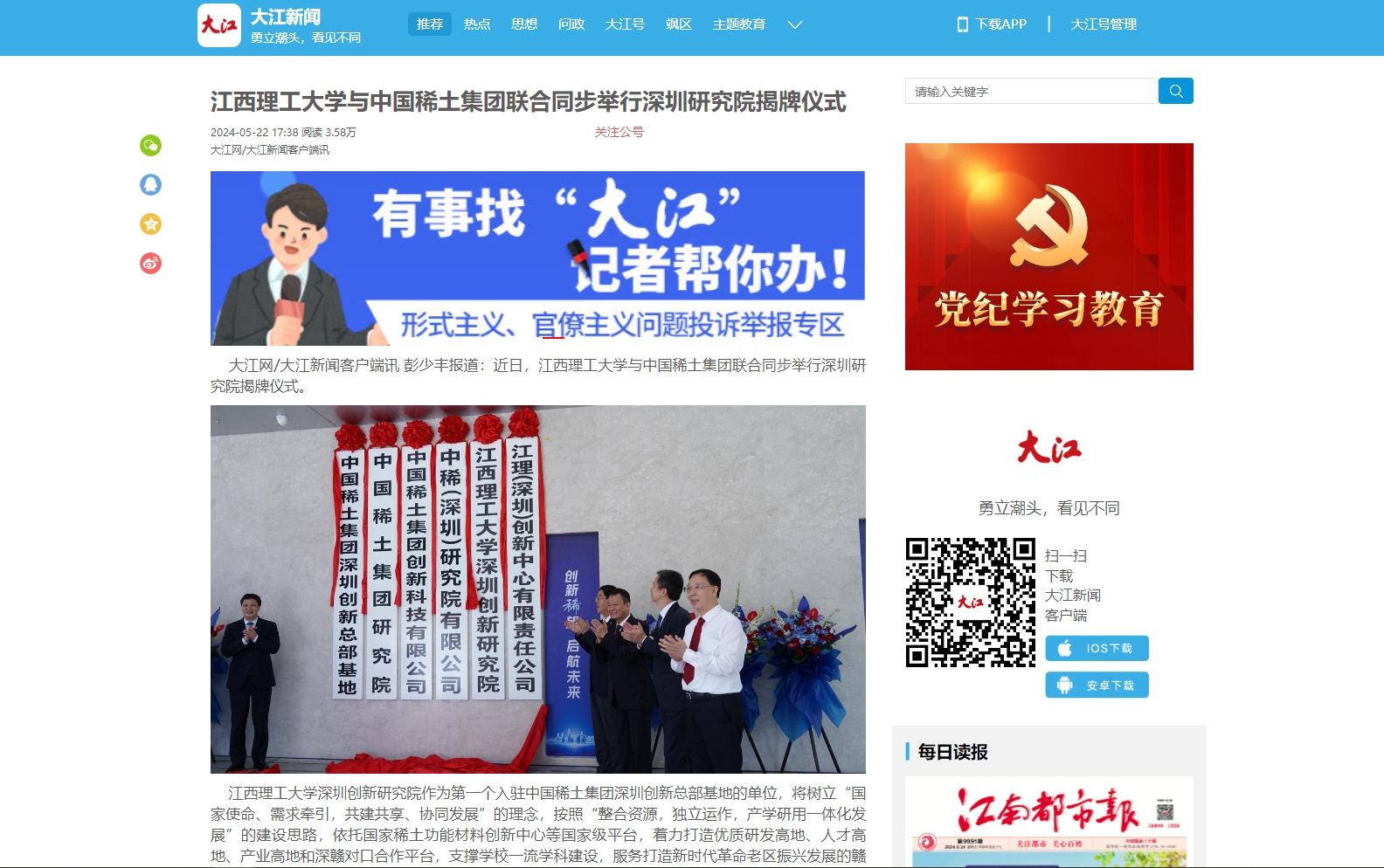 与南山区人民政府签订了战略合作框架协议,与中国稀土集团创新科技有限公司董事长詹伟签订江理(深圳)创新中心有限责任公司(抖阴