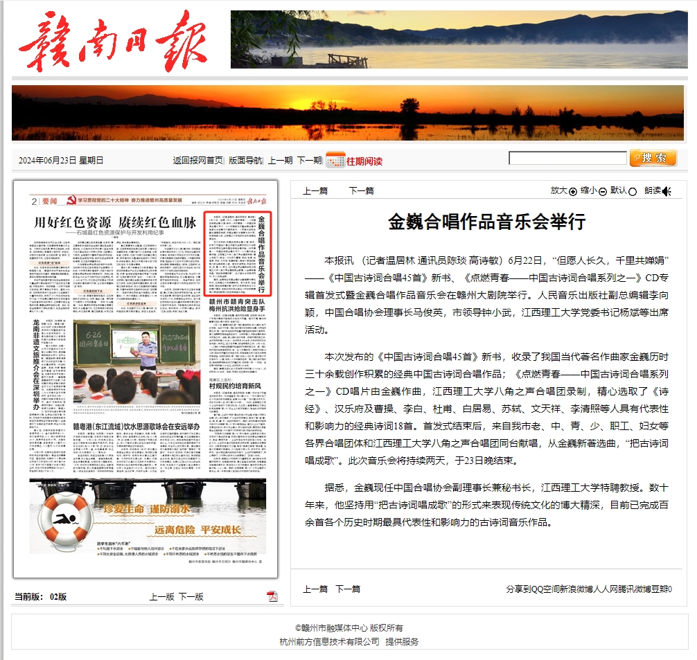 本报讯 (记者温居林 通讯员陈琰 高诗敏)6月22日,“但愿人长久,千里共婵娟”——《中国古诗词合唱45首》新书、《点燃青春——中国古诗词合唱系列之一》CD专辑首发式暨金巍合唱作品音乐会在赣州大剧院举行。人民音乐出版社副总编辑李向颖,中国合唱协会理事长马俊英,市领导钟小武,抖阴