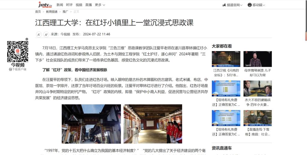 马克思主义学院“三色三维”思政课教学团队汪爱平老师在遂川县草林镇红圩小镇内,通过诵读红色诗词和参观伟人旧居,为土木与测绘工程学院“红土护圩,遂心井冈”2024年暑期“三下乡”社会实践队的成员们带来了一场传承红色基因、感受红色文化的沉浸式思政课。