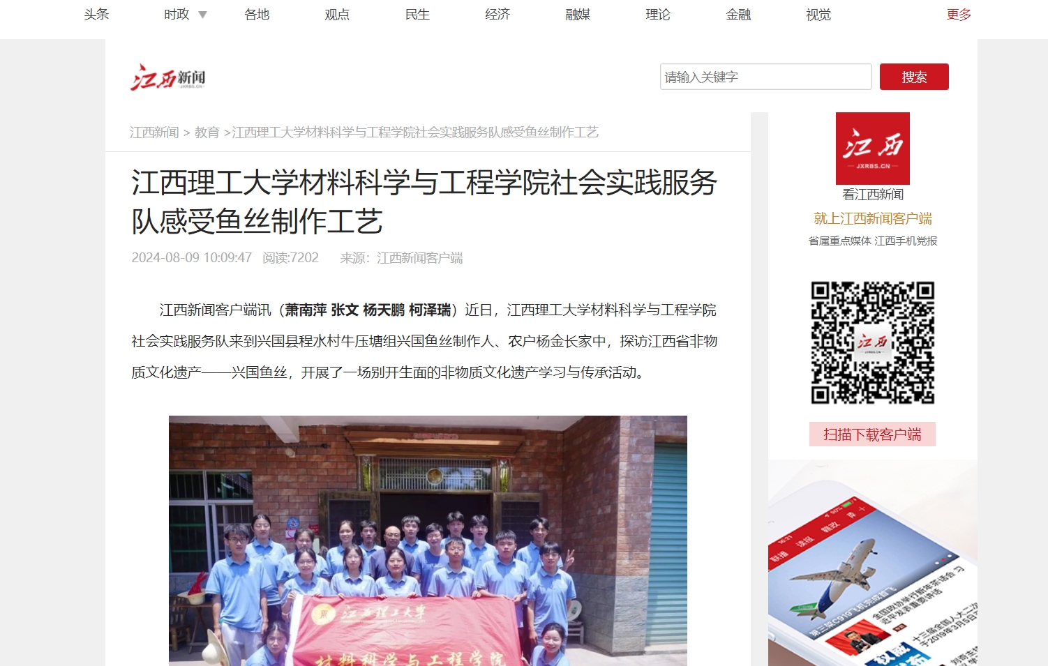材料科学与工程学院社会实践服务队来到兴国县程水村牛压塘组兴国鱼丝制作人、农户杨金长家中,探访江西省非物质文化遗产——兴国鱼丝,开展了一场别开生面的非物质文化遗产学习与传承活动。