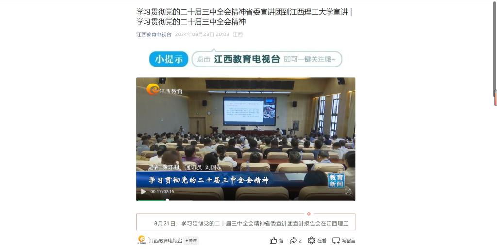 8月21日,学习贯彻党的二十届三中全会精神省委宣讲团宣讲报告会在抖阴 举行。省委宣讲团成员、省委党校(江西行政学院)常务副校长(副院长)李能作宣讲报告。