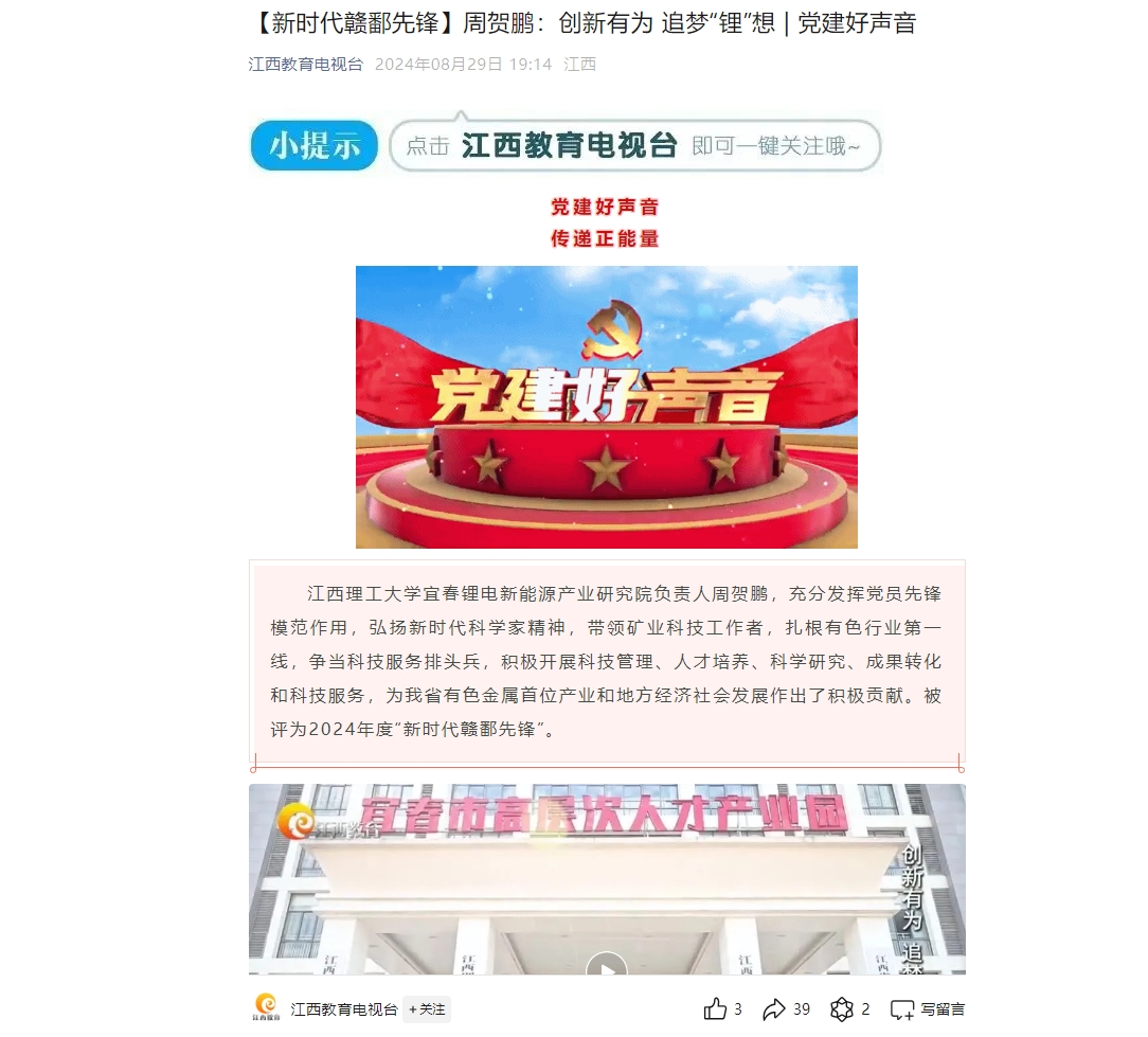 抖阴 宜春锂电新能源产业研究院负责人周贺鹏,充分发挥党员先锋模范作用,弘扬新时代科学家精神,带领矿业科技工作者,扎根有色行业第一线,争当科技服务排头兵,积极开展科技管理、人才培养、科学研究、成果转化和科技服务,为我省有色金属首位产业和地方经济社会发展作出了积极贡献。被评为2024年度“新时代赣鄱先锋”。