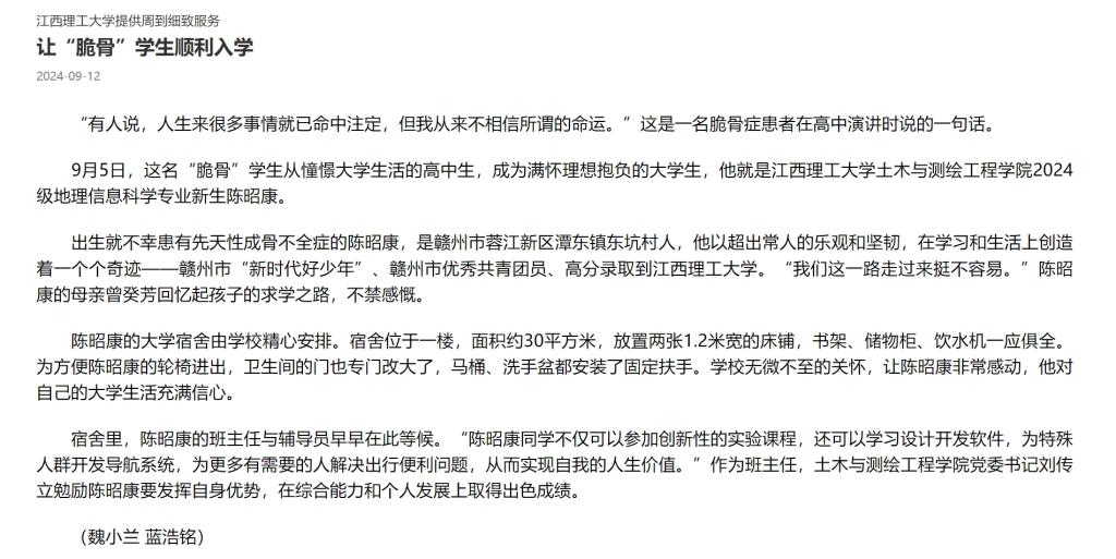 出生就不幸患有先天性成骨不全症的陈昭康,是赣州市蓉江新区潭东镇东坑村人,他以超出常人的乐观和坚韧,在学习和生活上创造着一个个奇迹——赣州市“新时代好少年”、赣州市优秀共青团员、高分录取到抖阴