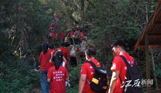 “晚霞映红于都河,渡口有一支难忘的歌,唱的是咱长征源,当年送走我的红军哥哥。”伴随着红歌,该校师生来到于都县祁禄山镇金沙村,找寻当年红军长征出发的足迹,沿着蜿蜒的小道一路向前。在高山密林间,在崎岖不平的红色小道上,大家沉浸式体验当年红军行军途中的艰辛,重温红色历史,感怀革命先辈坚定信念、不怕牺牲、勇往直前的革命意志和革命精神。