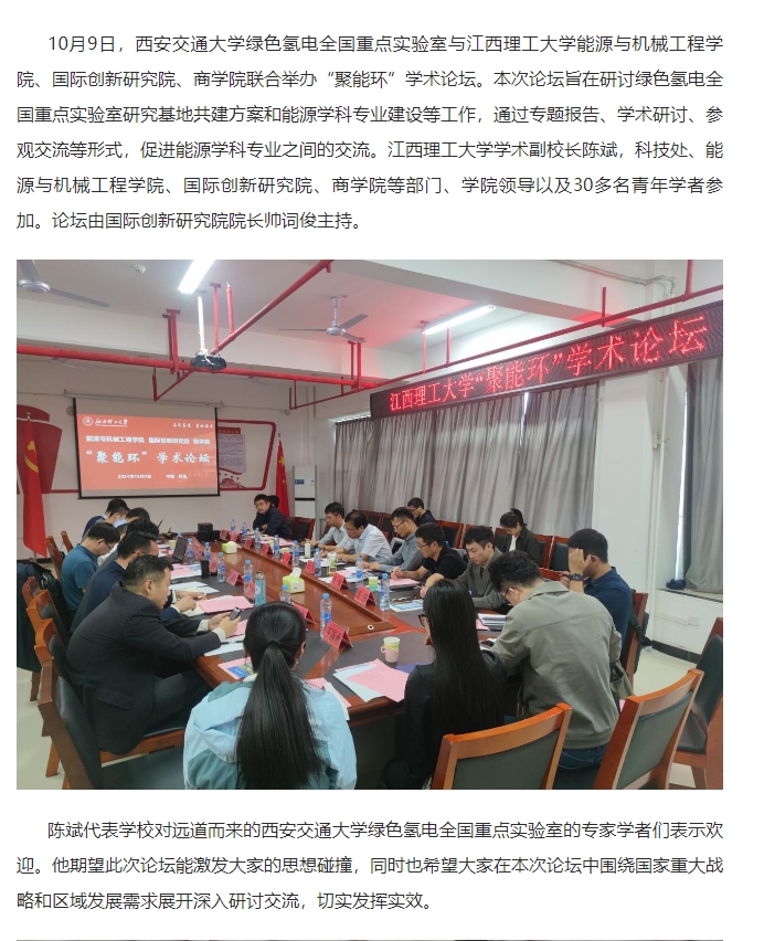 能源与机械工程学院、国际创新研究院、商学院联合举办“聚能环”学术论坛。本次论坛旨在研讨绿色氢电全国重点实验室研究基地共建方案和能源学科专业建设等工作,通过专题报告、学术研讨、参观交流等形式,促进能源学科专业之间的交流。抖阴