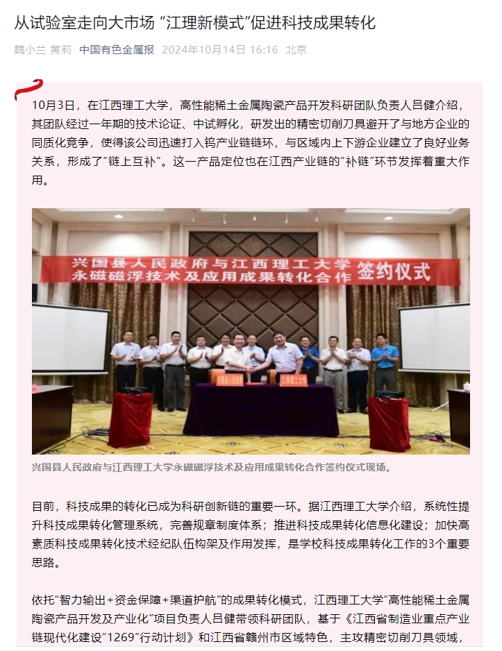 将更加瞄准国家战略和行业需求,紧密对接江西省“1269”行动计划,聚焦有色金属、钢铁、新能源重点产业链,不断深化成果转化机制体制改革,落实江西省科技委协同推进“1+M+N”科技成果转移转化服务体系要求,积极探索成果转化新路径新模式,促进创新链、产业链、资金链、人才链与教育链深度融合,贡献新质生产力发展,推进科技创新和成果转化再上新台阶。