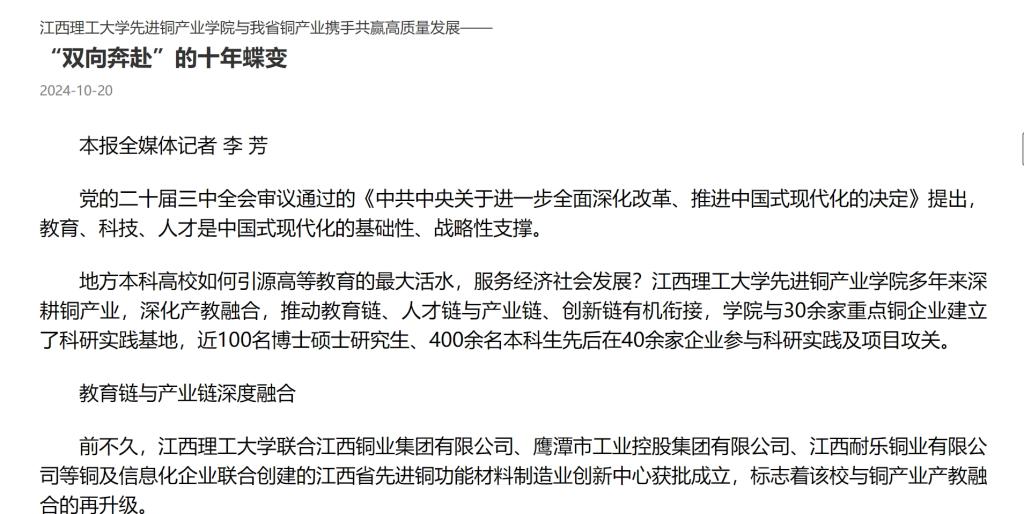 优化教育链、激活创新链、服务产业链,助力铜产业高质量发展的生动实践。