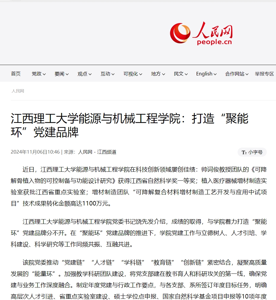 能源与机械工程学院在科技创新领域屡创佳绩:帅词俊教授团队的《可降解骨植入物的可控制备与功能设计研究》获得江西省自然科学奖一等奖;植入医疗器械增材制造实验室获批江西省重点实验室;增材制造团队“可降解复合材料增材制造工艺开发与应用中试项目”技术成果转化金额高达1100万元。
