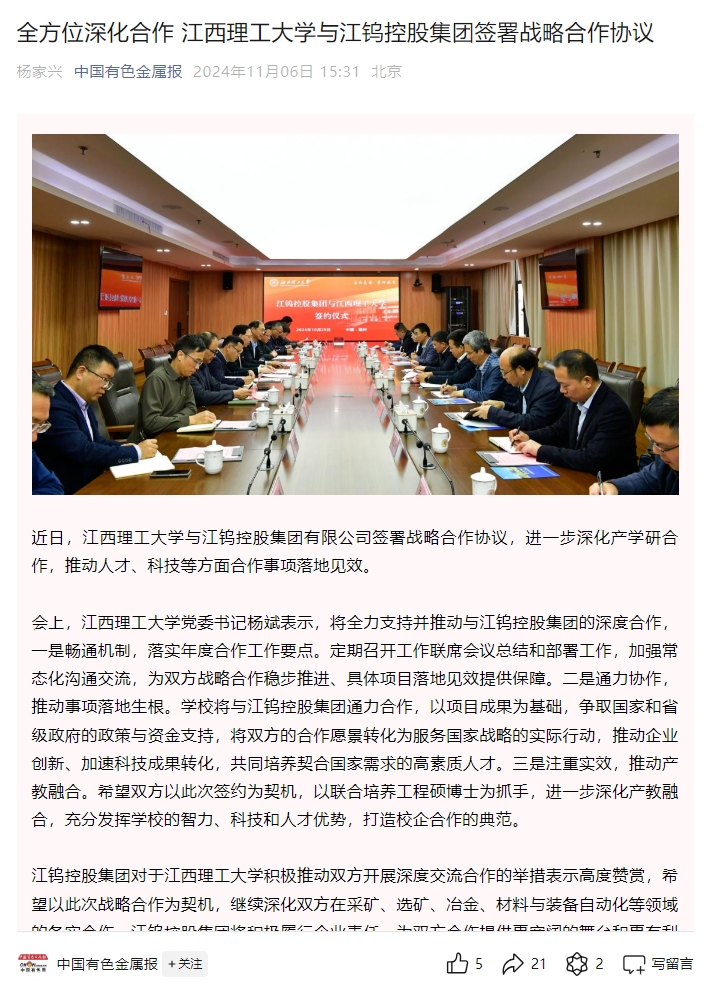 与江钨控股集团有限公司双方签署了战略合作协议、共建先进金属材料江西省实验室合作协议,双方还签订了硕博士联合培养的合作协议和科研项目合同。抖阴