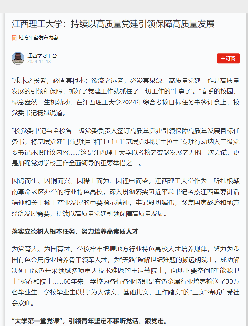 作为一所扎根赣南革命老区办学的行业特色高校,深入贯彻落实习近平总书记考察江西重要讲话精神和关于稀土产业发展的重要指示精神,牢记殷切嘱托,聚焦国家战略和地方经济发展需要,持续以高质量党建引领保障高质量发展。