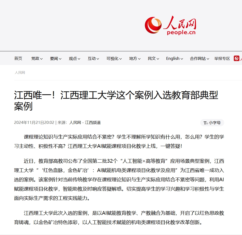 “‘红色血脉,金色矿冶’:AI赋能机电类课程项目化教学及应用”为江西省唯一成功入选的案例。该案例针对当前传统教学存在课程理论知识与生产实际应用结合不紧密等问题,利用AI赋能课程项目化教学,智能助教及时响应答疑解惑。切实提高学生的学习兴趣和学习积极性与学生面向实际生产需求的工程实践能力。