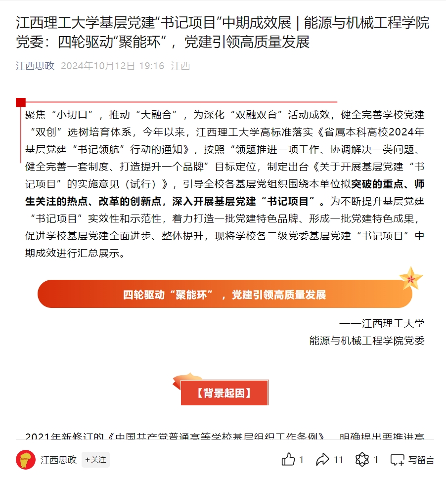 高标准落实《省属本科高校2024年基层党建“书记领航”行动的通知》,按照“领题推进一项工作、协调解决一类问题、健全完善一套制度、打造提升一个品牌”目标定位,制定出台《关于开展基层党建“书记项目”的实施意见(试行)》,引导全校各基层党组织围绕本单位拟突破的重点、师生关注的热点、改革的创新点,深入开展基层党建“书记项目”。为不断提升基层党建“书记项目”实效性和示范性,着力打造一批党建特色品牌、形成一批党建特色成果,促进学校基层党建全面进步、整体提升,现将学校各二级党委基层党建“书记项目”中期成效进行汇总展示。