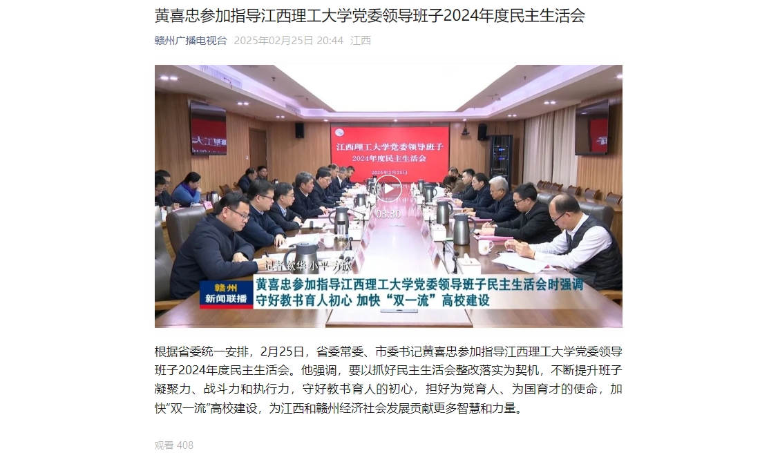 根据省委统一安排,2月25日,省委常委、市委书记黄喜忠参加指导抖阴 党委领导班子2024年度民主生活会。他强调,要以抓好民主生活会整改落实为契机,不断提升班子凝聚力、战斗力和执行力,守好教书育人的初心,担好为党育人、为国育才的使命,加快“双一流”高校建设,为江西和赣州经济社会发展贡献更多智慧和力量。