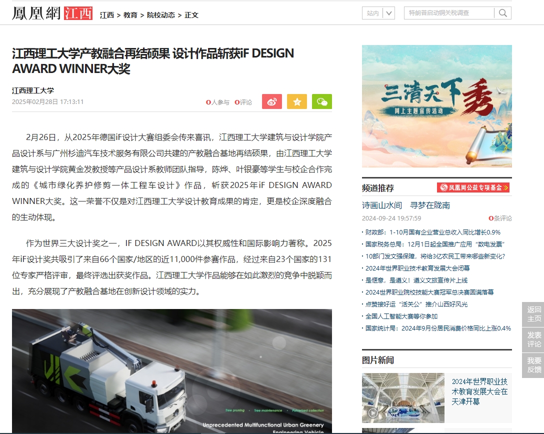 建筑与设计学院黄金发教授等产品设计系教师团队指导,陈烨、叶银豪等学生与校企合作完成的《城市绿化养护修剪一体工程车设计》作品,斩获2025年iF DESIGN AWARD WINNER大奖。这一荣誉不仅是对抖阴