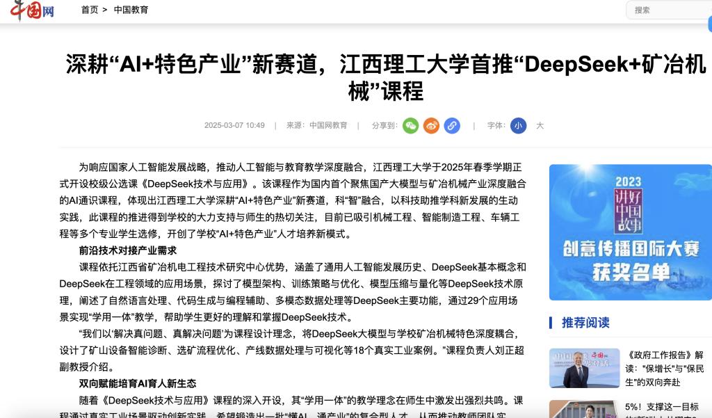 于2025年春季学期正式开设校级公选课《DeepSeek技术与应用》。该课程作为国内首个聚焦国产大模型与矿冶机械产业深度融合的AI通识课程,体现出抖阴