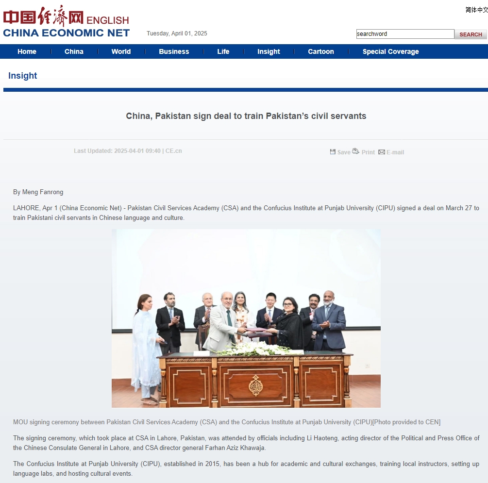 LAHORE, Apr 1 (China Economic Net) - Pakistan Civil Services Academy (CSA) and the Confucius Institute at Punjab University (CIPU) signed a deal on March 27 to train Pakistani civil servants in Chinese language and culture.