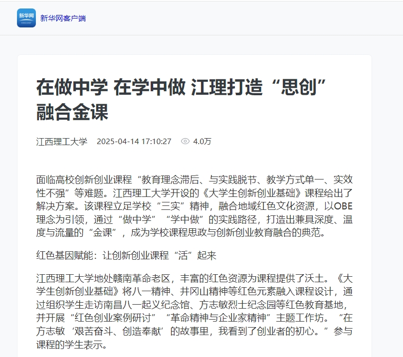 开设的《大学生创新创业基础》课程给出了解决方案。该课程立足学校“三实”精神,融合地域红色文化资源,以OBE理念为引领,通过“做中学”“学中做”的实践路径,打造出兼具深度、温度与流量的“金课”,成为学校课程思政与创新创业教育融合的典范。
