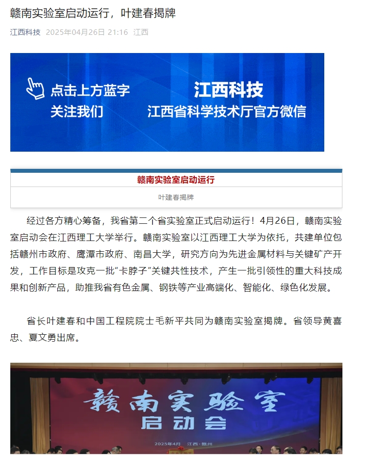 经过各方精心筹备,我省第二个省实验室正式启动运行!4月26日,赣南实验室启动会在抖阴