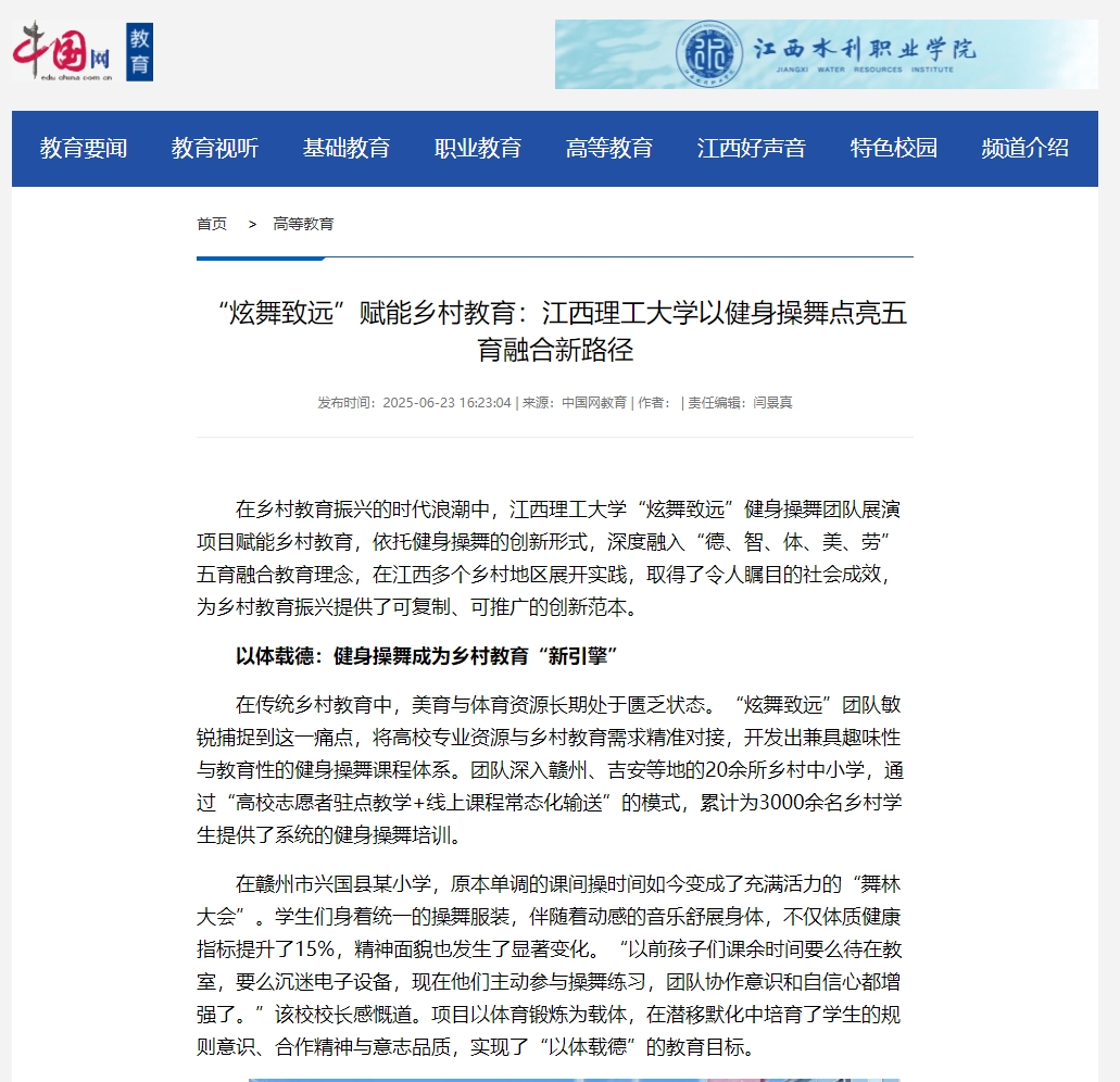 “炫舞致远”健身操舞团队展演项目赋能乡村教育,依托健身操舞的创新形式,深度融入“德、智、体、美、劳”五育融合教育理念,在江西多个乡村地区展开实践,取得了令人瞩目的社会成效,为乡村教育振兴提供了可复制、可推广的创新范本。