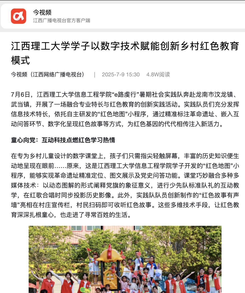 信息工程学院“e路虔行”暑期社会实践队奔赴龙南市汶龙镇、武当镇,开展了一场融合专业特长与红色教育的创新实践活动。实践队员们充分发挥信息技术特长,依托自主研发的“红色地图”小程序,通过精准标注革命遗址、嵌入互动问答环节、数字化呈现红色故事等方式,为红色基因的代代相传注入新活力。