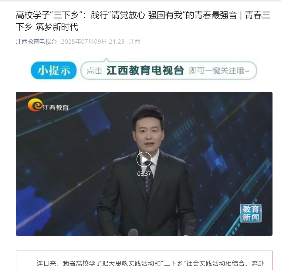 上一条:《赣州头条》:抖阴 商学院暑期“三下乡”多维实践赋能乡村 青春力量书写振兴新篇 下一条:《新华网》:江理学子青春实践进乡村 科普亲情安全行