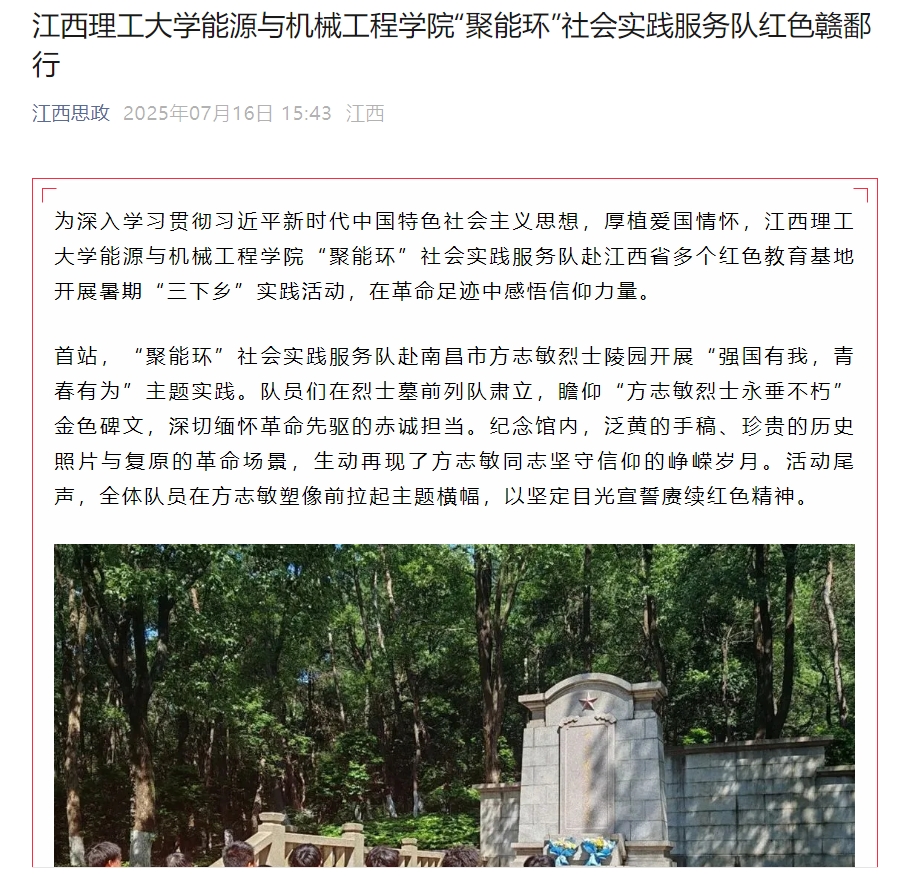 首站,“聚能环”社会实践服务队赴南昌市方志敏烈士陵园开展“强国有我,青春有为”主题实践。队员们在烈士墓前列队肃立,瞻仰“方志敏烈士永垂不朽”金色碑文,深切缅怀革命先驱的赤诚担当。纪念馆内,泛黄的手稿、珍贵的历史照片与复原的革命场景,生动再现了方志敏同志坚守信仰的峥嵘岁月。活动尾声,全体队员在方志敏塑像前拉起主题横幅,以坚定目光宣誓赓续红色精神。