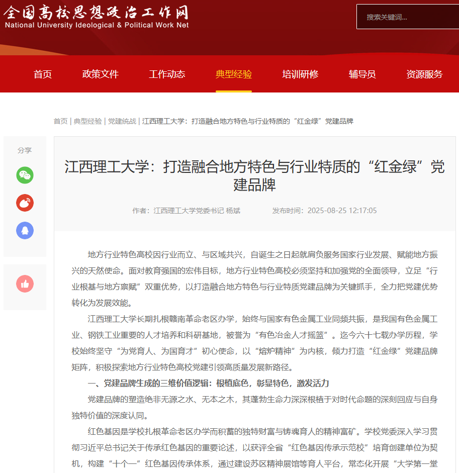 筑牢“1”核。学校扎根红土、服务有色,立足服务国家战略的深厚积淀,紧扣新时代有色金属工业行业使命与教育强国建设要求,将“红金绿”确立为统领全局的校级核心党建品牌。“红”筑忠诚,以“领航工程”定向、“薪火工程”铸魂,将红色基因深度融入办学治校血脉,筑牢“赤诚担当”政治根基;“金”显本色,以“先锋工程”强能力、“清廉工程”守底线,引导党员干部在服务稀土及关键矿产供应安全中锤炼“坚韧实干”过硬本领;“绿”创未来,以“创新工程”激活力、“惠民工程”增福祉,将绿色发展理念转化为创新动能,让发展成果惠及师生,彰显“创新突破”时代担当。