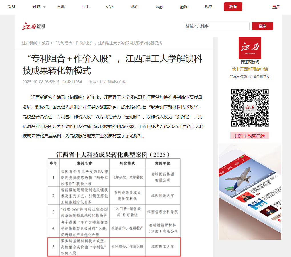 紧密聚焦江西省加快推进制造业高质量发展、积极打造国家级先进制造业集群的战略部署,成果转化项目“聚焦铜基新材料技术攻坚,高校整合高价值‘专利包’作价入股”以专利组合为“金钥匙”、以作价入股为“新路径”,凭借对产业升级的显著推动作用及对成果转化模式的创新突破,于近日成功入选2025江西省十大科技成果转化典型案例,为高校服务地方产业发展树立了示范标杆。
