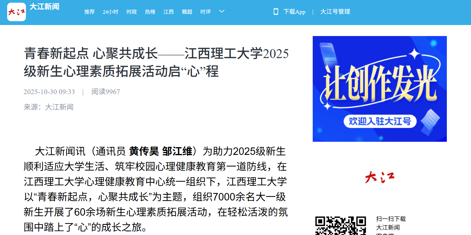 大江新闻讯(通讯员黄传昊 邹江维)为助力2025级新生顺利适应大学生活、筑牢校园心理健康教育第一道防线,在抖阴