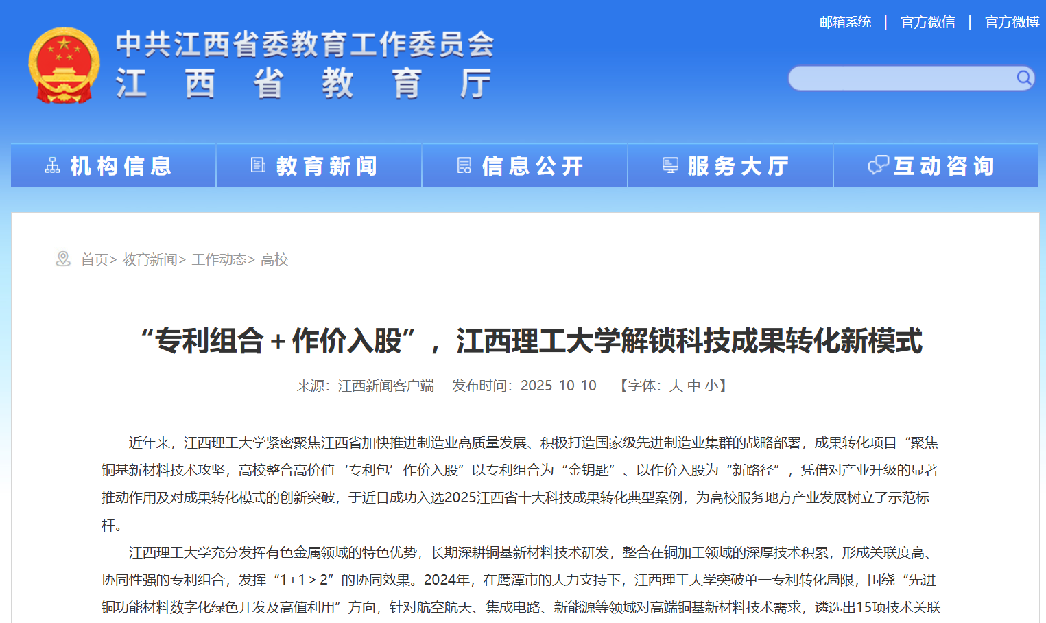 紧密聚焦江西省加快推进制造业高质量发展、积极打造国家级先进制造业集群的战略部署,成果转化项目“聚焦铜基新材料技术攻坚,高校整合高价值‘专利包’作价入股”以专利组合为“金钥匙”、以作价入股为“新路径”,凭借对产业升级的显著推动作用及对成果转化模式的创新突破,于近日成功入选2025江西省十大科技成果转化典型案例,为高校服务地方产业发展树立了示范标杆。