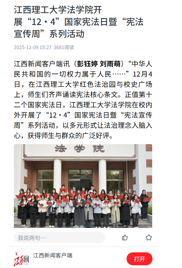 江西新闻客户端讯(彭钰婷 刘雨萌)“中华人民共和国的一切权力属于人民……”12月4日,在抖阴