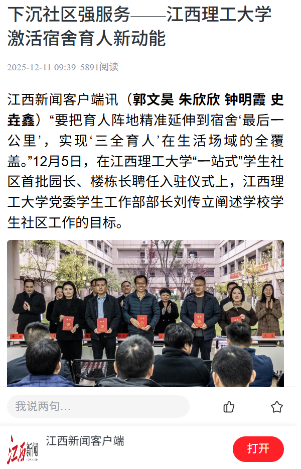 江西新闻客户端讯(郭文昊 朱欣欣 钟明霞 史垚鑫)“要把育人阵地精准延伸到宿舍‘最后一公里’,实现‘三全育人’在生活场域的全覆盖。”12月5日,在抖阴