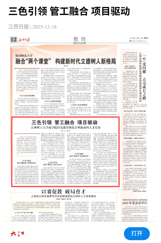 商学院将锚定学校党建品牌的“红铸忠诚、金淬担当、绿创未来”核心要义,深耕“数字商科”办学特色,精准对接有色金属产业需求,纵深推进“三色”引领育人改革,锻造更多“靠得住、用得上、留得下”的复合型实战人才,为江西有色金属产业数字化转型注入强劲动能,在学校高质量发展征程中书写商学院精彩篇章。(晁 云 刘 宇)