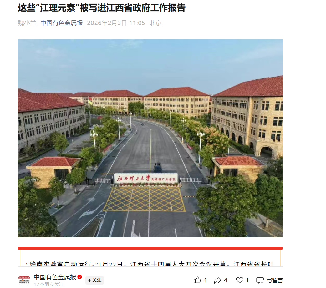 在回顾2025年工作时,该报告1次提到“江理元素”,明确点出“赣南实验室启动运行”。此前,赣南实验室启动会在抖阴