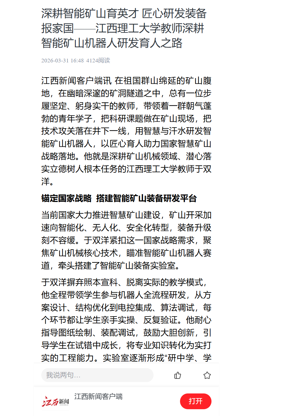 江西新闻客户端讯 在祖国群山绵延的矿山腹地,在幽暗深邃的矿洞隧道之中,总有一位步履坚定、躬身实干的教师,带领着一群朝气蓬勃的青年学子,把科研课题做在矿山现场,把技术攻关落在井下一线,用智慧与汗水研发智能矿山机器人,以匠心育人助力国家智慧矿山战略落地。他就是深耕矿山机械领域、潜心落实立德树人根本任务的抖阴