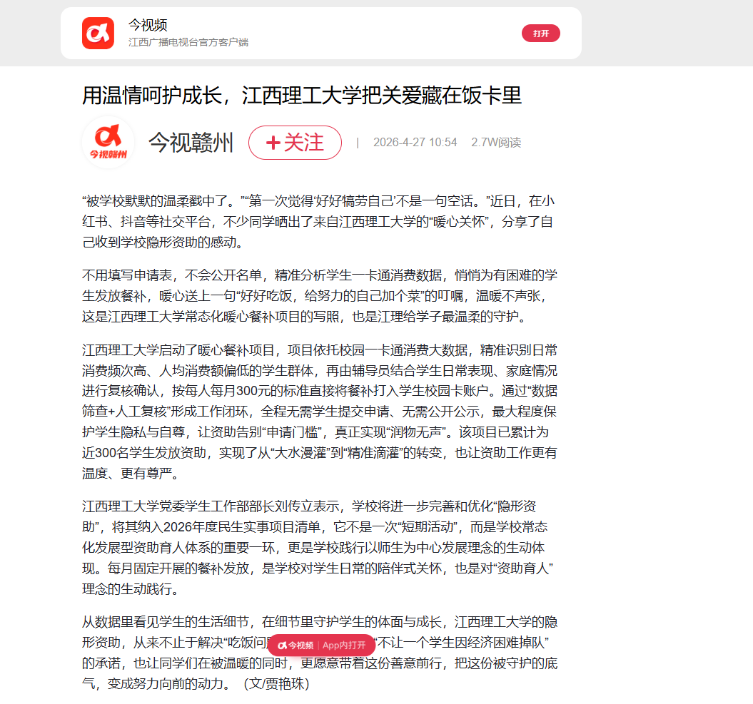 的隐形资助,从来不止于解决“吃饭问题”,更传递着学校“不让一个学生因经济困难掉队”的承诺,也让同学们在被温暖的同时,更愿意带着这份善意前行,把这份被守护的底气,变成努力向前的动力。(文/贾艳珠)