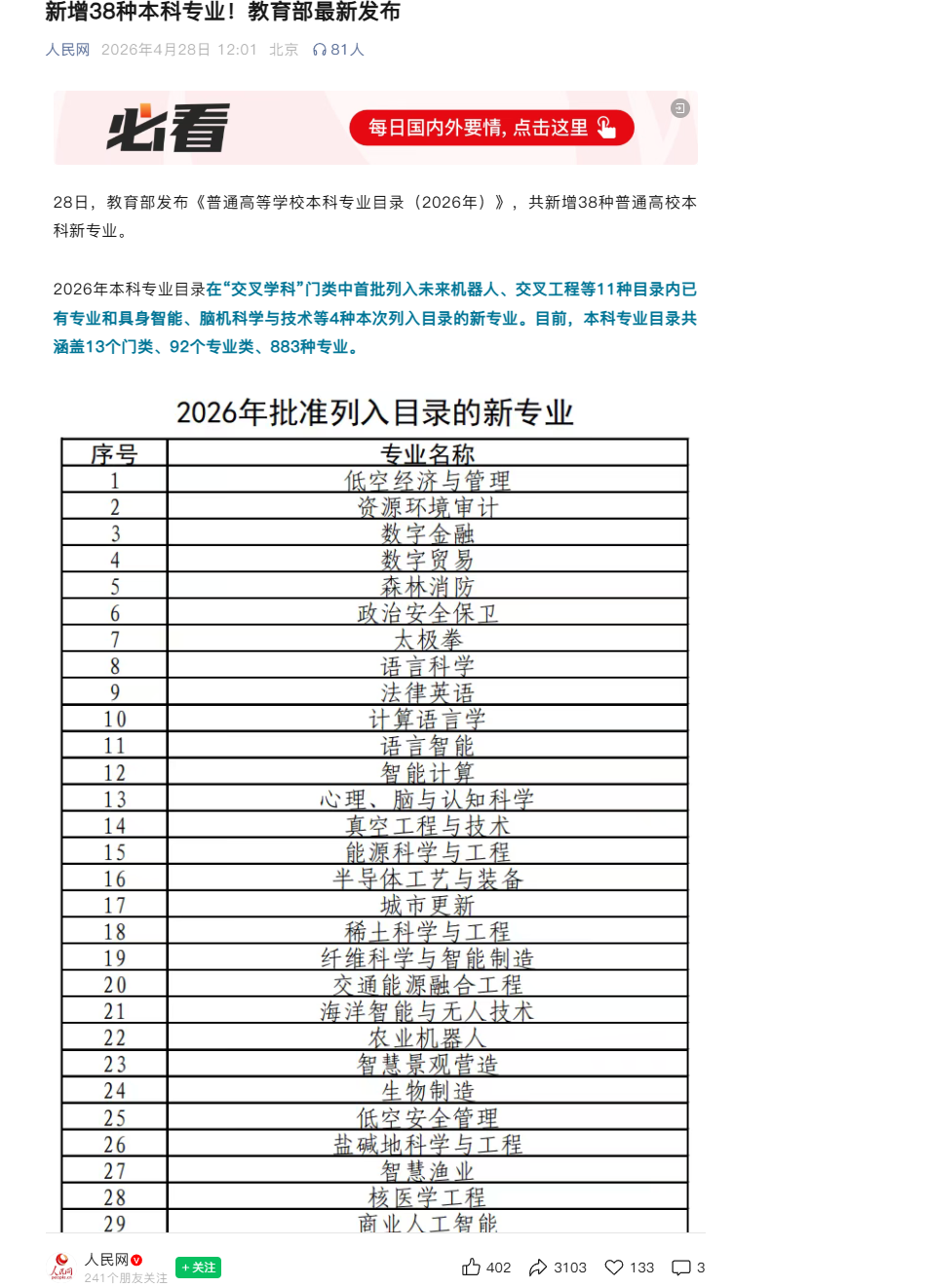 28日,教育部发布《普通高等学校本科专业目录(2026年)》,共新增38种普通高校本科新专业。