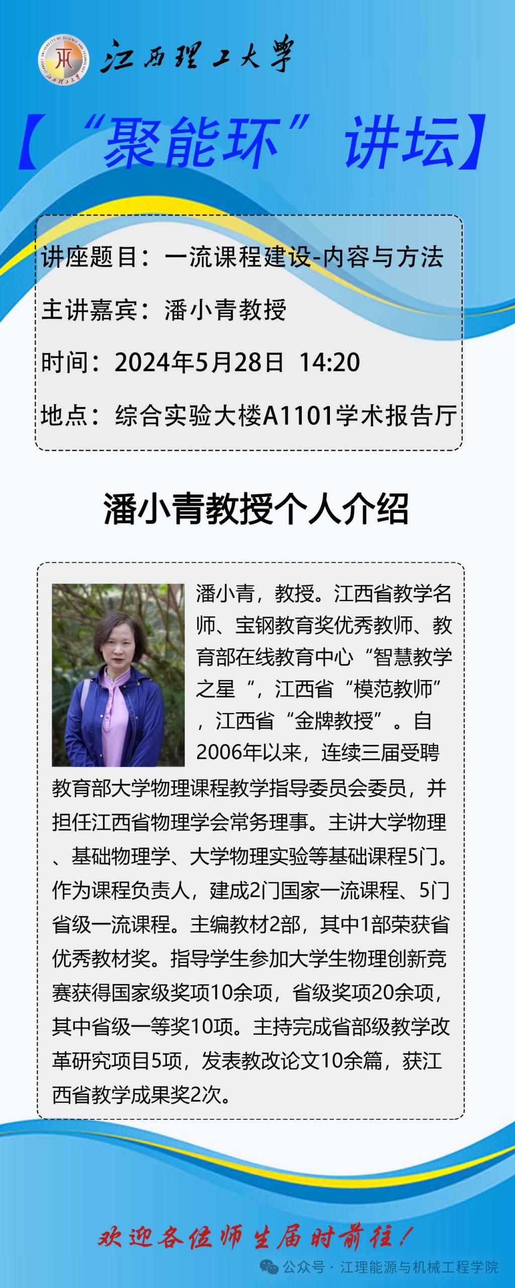 潘小青,教授。江西省教学名师、宝钢教育奖优秀教师、教育部在线教育中心“智慧教学之星“,江西省“模范教师”,江西省“金牌教授”。自2006年以来,连续三届受聘教育部大学物理课程教学指导委员会委员,并担任江西省物理学会常务理事。主讲大学物理、基础物理学、大学物理实验等基础课程5门。作为课程负责人,建成2门国家一流课程、5门省级一流课程。主编教材2部,其中1部荣获省优秀教材奖。指导学生参加大学生物理创新竞赛获得国家级奖项10余项,省级奖项20余项,其中省级一等奖10项。主持完成省部级教学改革研究项目5项,发表教改论文10余篇,获江西省教学成果奖2次。